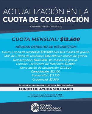 Les informamos que a partir del 1 de octubre de 2025 la cuota mensual de colegiación será de $12.500, monto que contempla el aporte solidario al Fondo de Ayuda Solidario.